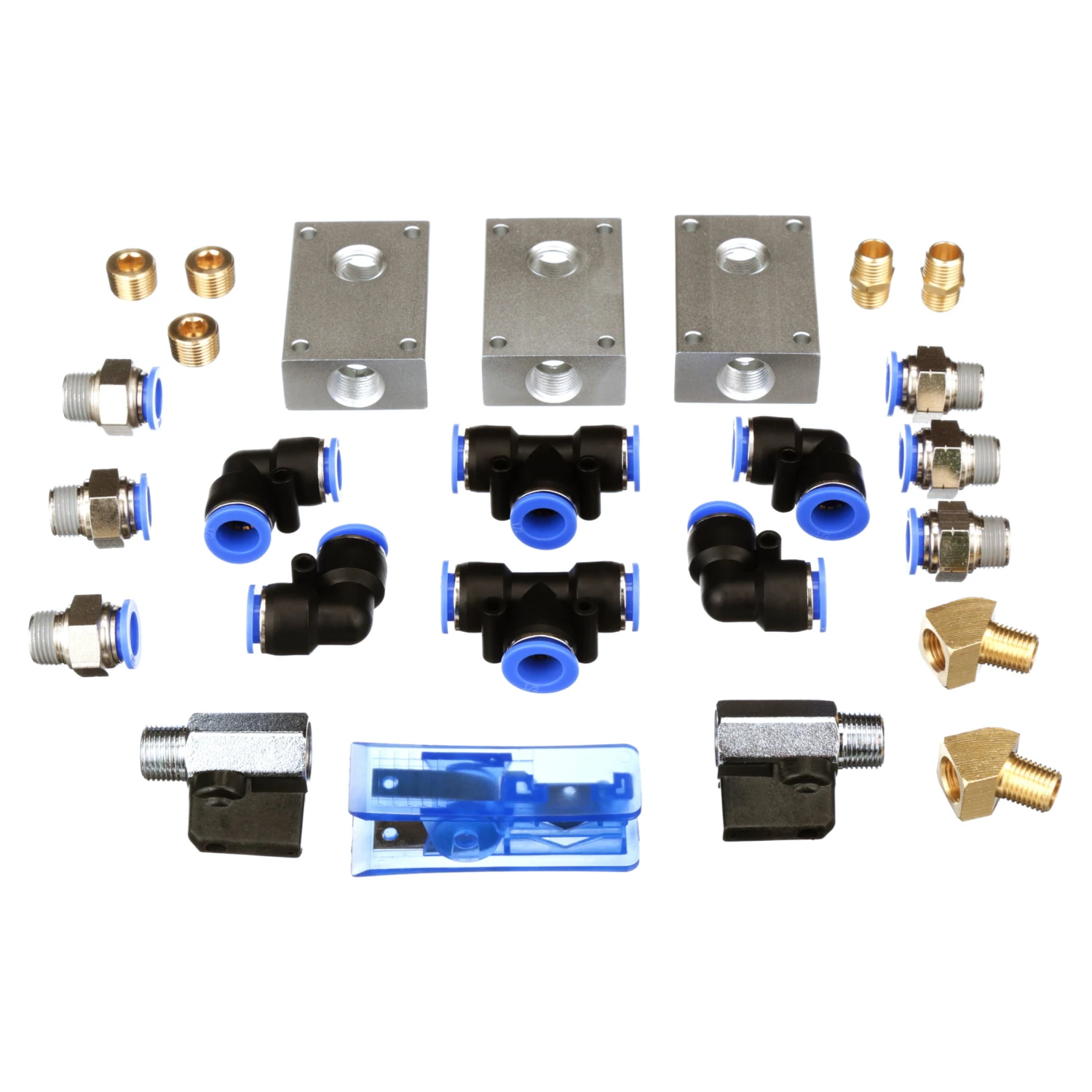 - (2) Outlet Blocks, (1) Manifold/Splitter Block (2) 3/8-Inch NPT Ball Valve, (2) 1/4-Inch NPT Male to Male Connectors, (2) 1/2-Inch Push-To-Connect T-Fittings, (4) 1/2-Inch Push-To-Connect Elbow Fittings, (6) 1/2-Inch to 3/8-Inch NPT Push-To-Connect Unions, (3) 3/8-Inch NPT Stop Plugs