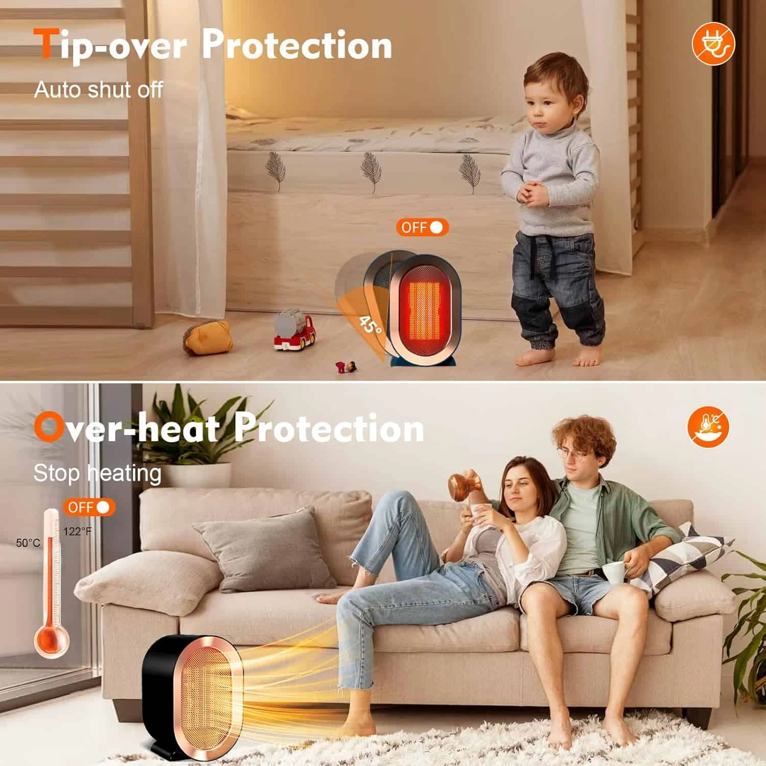 - SAFETY&&PROTECTION – QQT ceramic space heater is made of advanced PTC ceramic heating technology, upgraded abs flame retardant material, 45 ° dumping protection, turning off the space heater when overturning (only when standing stably can it output heat for you), insulating shell, and enhanced safety plug. It heats up day and night, avoiding any fire hazard, and protecting the safety of your family.