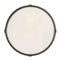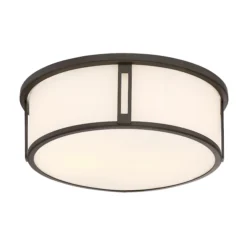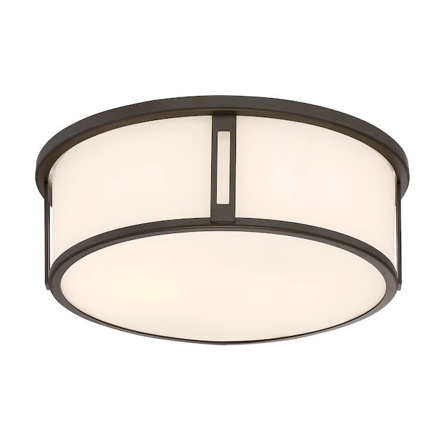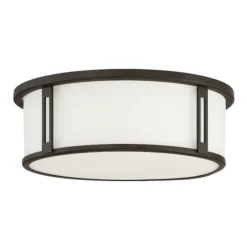 The Harbor flush mount is simplistic in design and suitable for a variety of home décor styles. The bronze finish circles the etched glass with metal slat details banded top and bottom.