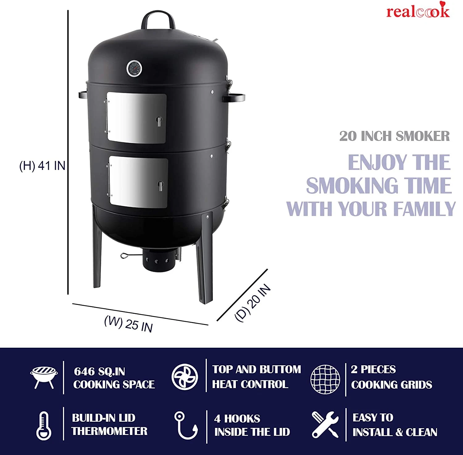 Realcook Charcoal BBQ Smoker Grill – 20 Inch Vertical Smoker for Outdoor Cooking Grilling