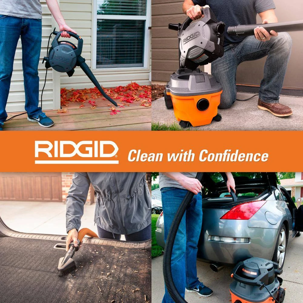 The RIDGID 4 Gal. wet/dry vac is a multi-functional tool that combines portable power and a handheld blower. This compact powerhouse packs a heavy-duty 6.0 peak horsepower rated motor to tackle even the messiest jobs. The power head of the wet/dry vacuum detaches and quickly converts into a handheld blower with a locking wand that outperforms most dedicated leaf blowers. The quick-release cord wrap lets you spend less time unwrapping the 20 ft. cord and more time on the job. The caddy conveniently keeps your accessories and the hose close at hand. Combined with the Premium Car Cleaning Accessory Kit, you’ll have everything you need to keep your vehicle neat and tidy. This kit features 7-pieces including a 10 ft. premium hose, soft bristle brush, stiff bristle brush, crevice tool, claw nozzle, hose-to-hose adapter and a step-down adapter (to connect 1-1/4 in. accessories to a 2-1/2 in. hose).
