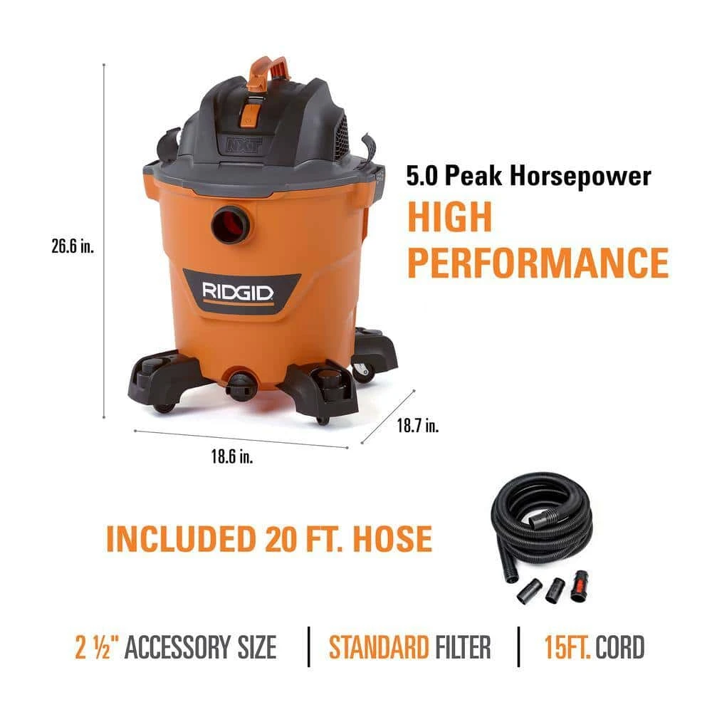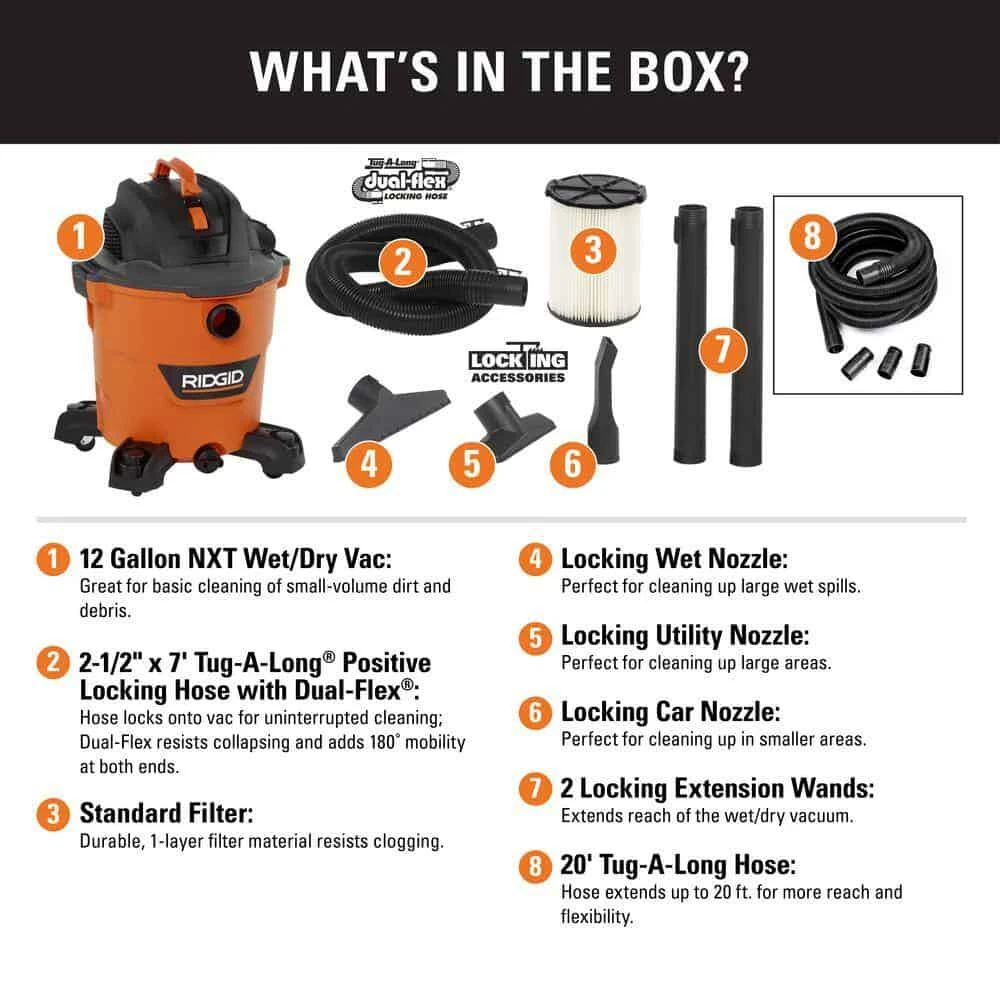 - Includes RIDGID 12 Gallon 5.0 Peak Horsepower NXT Wet/Dry Shop Vacuum featuring an additional hose that is 20 ft. long – best for tough, moderate-sized wet or dry cleanups