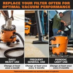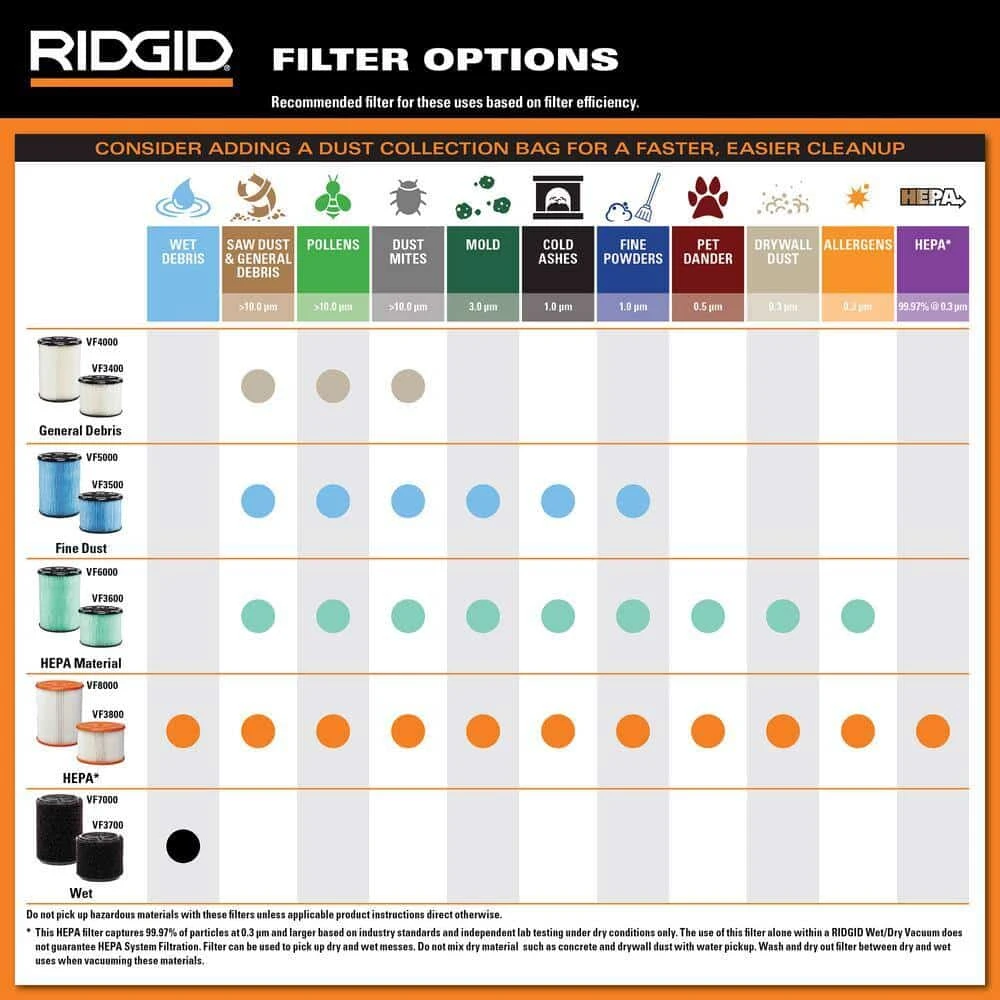 - RIDGID offers a wide range of replacement filtration options (VF4000 general debris filter, VF5000 fine dust filter, VF6000 HEPA material filter, VF7000 wet application filter and VF8000 HEPA filter; sold separately) that capture a variety of dirt and debris and VF3502 Size A dust collection bags (sold separately) for quick and easy cleanups