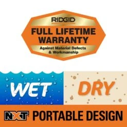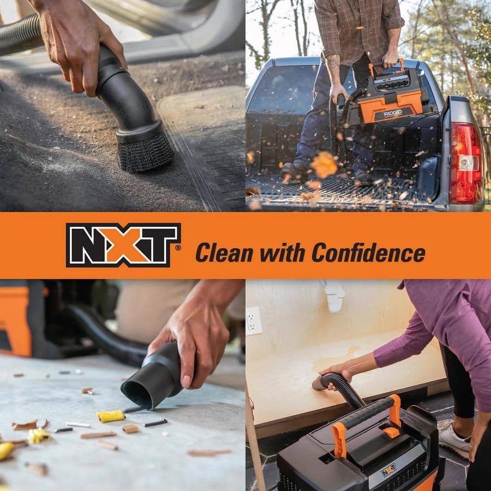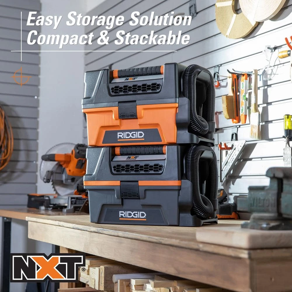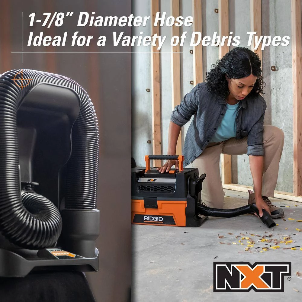 - Includes RIDGID 3 Gal. NXT wet/dry vac (corded application), fine dust filter, crevice tool, dusting brush and 6 ft. collapsible, rubberized hose