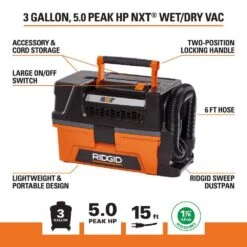 Be prepared for your next mess with the RIDGID 3 Gal. 5.0 Peak HP NXT Wet/Dry Vac – store it, stack it, move it. The compact, lightweight toolbox design is the perfect companion for those looking for a small yet powerful vac they can take from project to project. Designed with storage in mind, this 3 Gal. wet/dry vac fits into small, out-of-the-way spaces with the bonus of stacking. With the integrated storage compartment, accessories are organized and secured onboard so you are ready to grab-and-go at any time. The crevice tool can be used for tight, intricate places. The dusting brush can gently clean surfaces with care. The 6 ft., 1-7/8 in. hose features 360 maneuverability and resists collapsing. Plus, the exhaust port allows for blower functionality and the on/off switch is positioned so it can be easily turned on with 1 hand. The innovative RIDGID SWEEP feature is a suction-powered dustpan built right into the vac – sweep the dust directly into the shop vac or use it to glide over spilled areas. Backed by the full lifetime warranty, RIDGID proves that even the messiest of jobs can be the easiest to handle. Pro Tip: RIDGID filters help to maintain the power of the vac and extend vacuum life. Purchase a wet filter (VF3700, sold separately) to clean up wet messes or add a RIDGID dust bag (VF3501, sold separately) to the shop vacuum to keep the wet/dry vac drum clean and for quick pickup and disposal. 18-Volt Cordless 3 Gal. wet/dry vac unit (HD0318) also available.