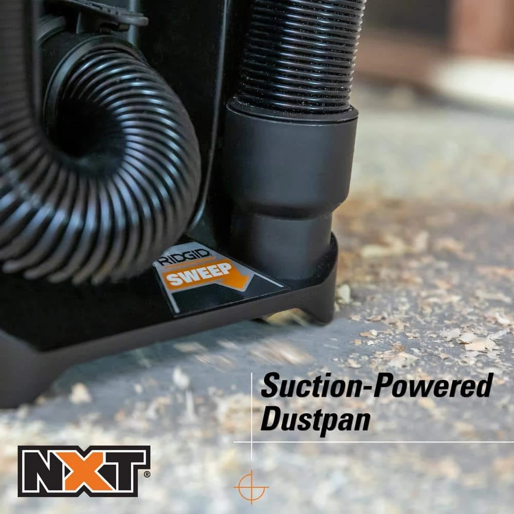 - Built-in, suction-powered RIDGID SWEEP feature for sweeping in dirt and debris or gliding over spilled messes