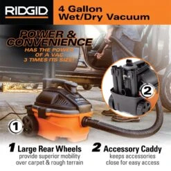 Take on projects confidently with the 4 Gallon Portable Wet/Dry Shop Vacuum featuring a specialized RIDGID shop vac accessory kit for different cleaning applications. The RIDGID attachments (Dual-Flex hose, utility nozzle, car nozzle and extension wands) included with this compact 4 gallon RIDGID wet/dry vac provides a more customized and efficient cleanup. The 3 extension wands extend the overall reach for hard-to-get-to places, the locking hose with Dual-Flex offers uninterrupted cleaning through its unique locking technology and the utility nozzle is perfect for cleaning up large areas. When you need more intricate cleaning options for smaller areas, the car nozzle will do the job. The included 4 gallon RIDGID shop vac is a small, lightweight vac that packs a punch with amped-up power and performance on the inside and a modern look on the outside. This vac has a 5.0 peak HP motor that can tackle even the messiest projects. The vac has large rear wheels and casters that provides great mobility over carpeted floors, thresholds and rough floors at jobsites. The included dust collection bags keep dirt and debris contained for no mess disposals. This is an ideal vacuum for car cleaning and in-home tasks. Pro Tip: Add a RIDGID filter (VF3500 – sold separately) to a RIDGID shop vac to maintain the power of the vac and extend vacuum life.