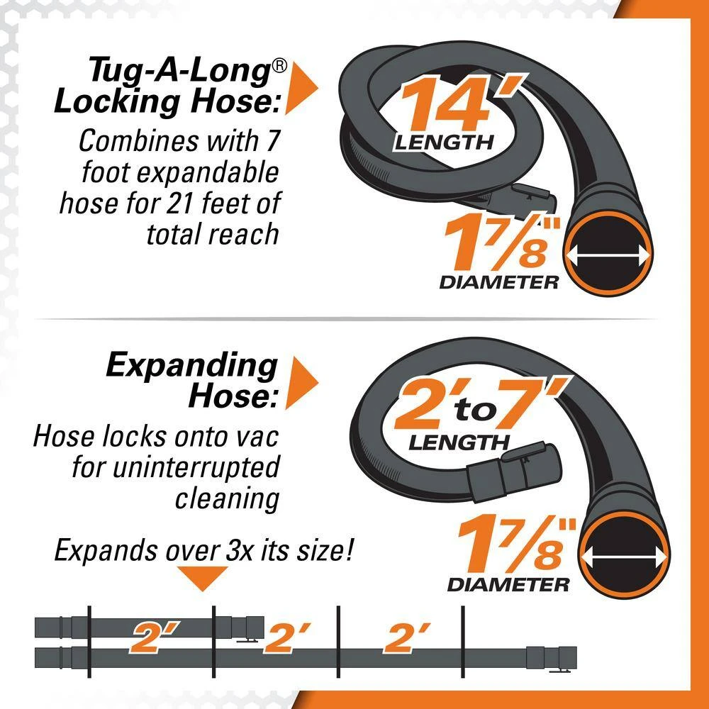 - 7 ft. collapsible hose combined with the 14 ft. hose provides 21 ft. of reach