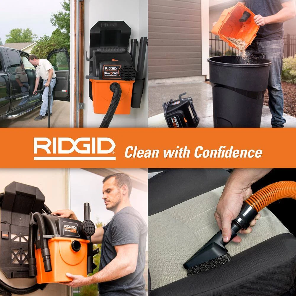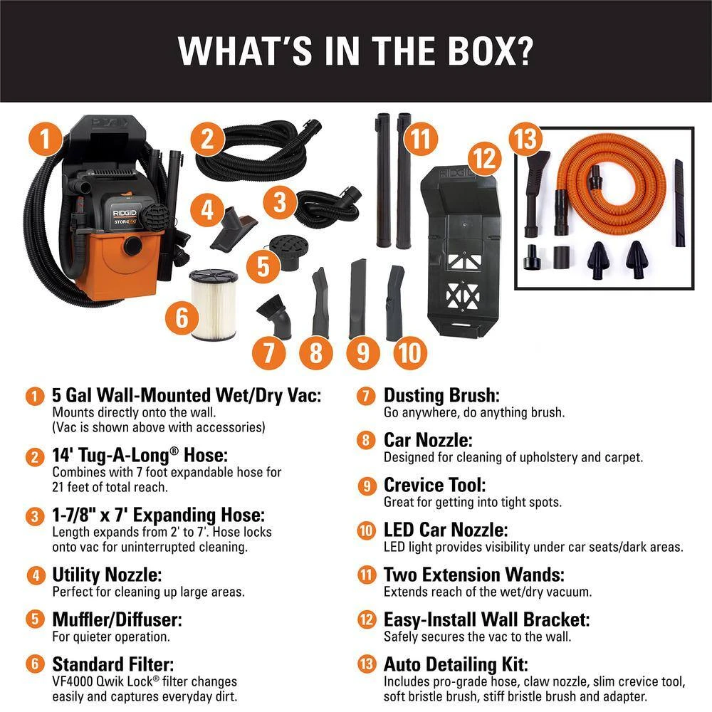 The RIDGID 5 Gallon 5.0 Peak Horsepower Stor-N-Go Wet/Dry Shop Vacuum featuring an LED Nozzle and Premium Car Cleaning Kit is a unique and innovative vacuum design. This shop vac provides powerful suction for heavy-duty clean. It also mounts directly onto the wall, making it a versatile space saver in your workshop or garage. It easily detaches from the wall bracket, making it portable; take it from your garage to your car to your jobsite. Plus, the included auto-detailing kit includes specialized accessories (pro-grade hose, claw nozzle, slim crevice tool, soft bristle brush, stiff bristle brush and adapter) to help you deep clean your car. For added convenience, store the hoses, cord, and accessories on the Stor-N-Go caddy, which also detaches from the vacuum drum. Included with the accessories are one 2 to 7 ft. expandable hose and one 14 ft. Tug-A-Long hose. Hook both hoses together for 21 ft. of total reach. Additional accessories include a utility nozzle, dusting brush, muffler/diffuser, car nozzle, crevice tool, two extension wands and the LED lighted car nozzle. Get everything you need in this all-in-one kit. The RIDGID 5 Gal. Stor-N-Go wet dry vac shop vac also comes with a standard filter (VF4000) and is compatible with other filters for any job or mess pickup (VF4000, VF5000, VF6000 and VF7000; sold separately).