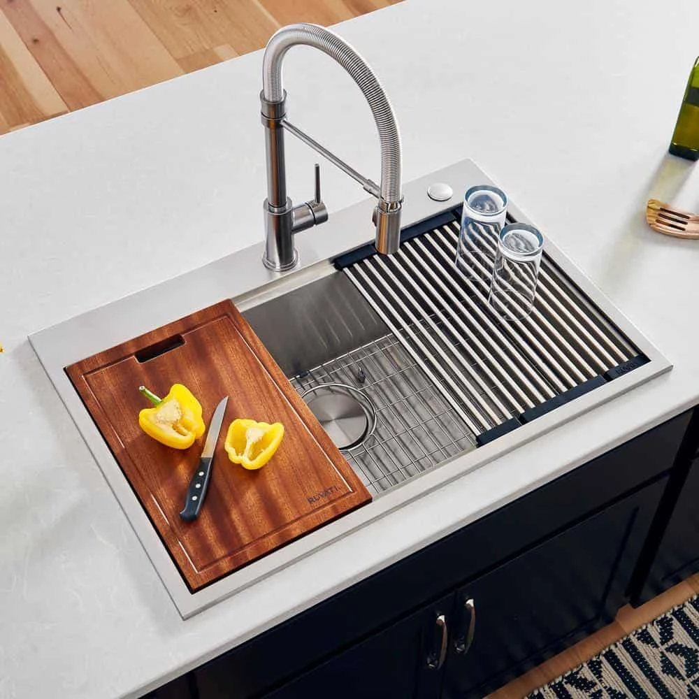 Sleek and stylish – the Siena collection from Ruvati combines a solid topmount rim with a functional workstation. Featuring sinks of all sizes, each is accompanied by a variety of accessories. From Ruvati’s innovative foldable drying rack to the classic cutting board and colander combination, everything you need is right where you need it. With a 1-inch wide and 1/4-inch high rim that sits on the countertop, you can do all your prep work right on top of your sink and keep your kitchen or bar free of mess. With the Siena collection, you can do so much more with your space.
