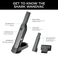 The Shark Wandvac WV200, Cord-Free Handheld Vacuum combines lightweight portability with the incredible suction power of a high-speed brushless motor. Weighing just 1.4 lbs., this lightweight handheld vacuum boasts a tapered nozzle for easy debris pickup and two accessories for tackling pet hair, upholstery, and tight spaces. Between cleanings, return your vacuum to the charging dock for fast recharging. Fast cleaning, always ready when you need it. The Shark Wandvac: Extraordinary power for the everyday mess.