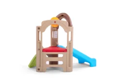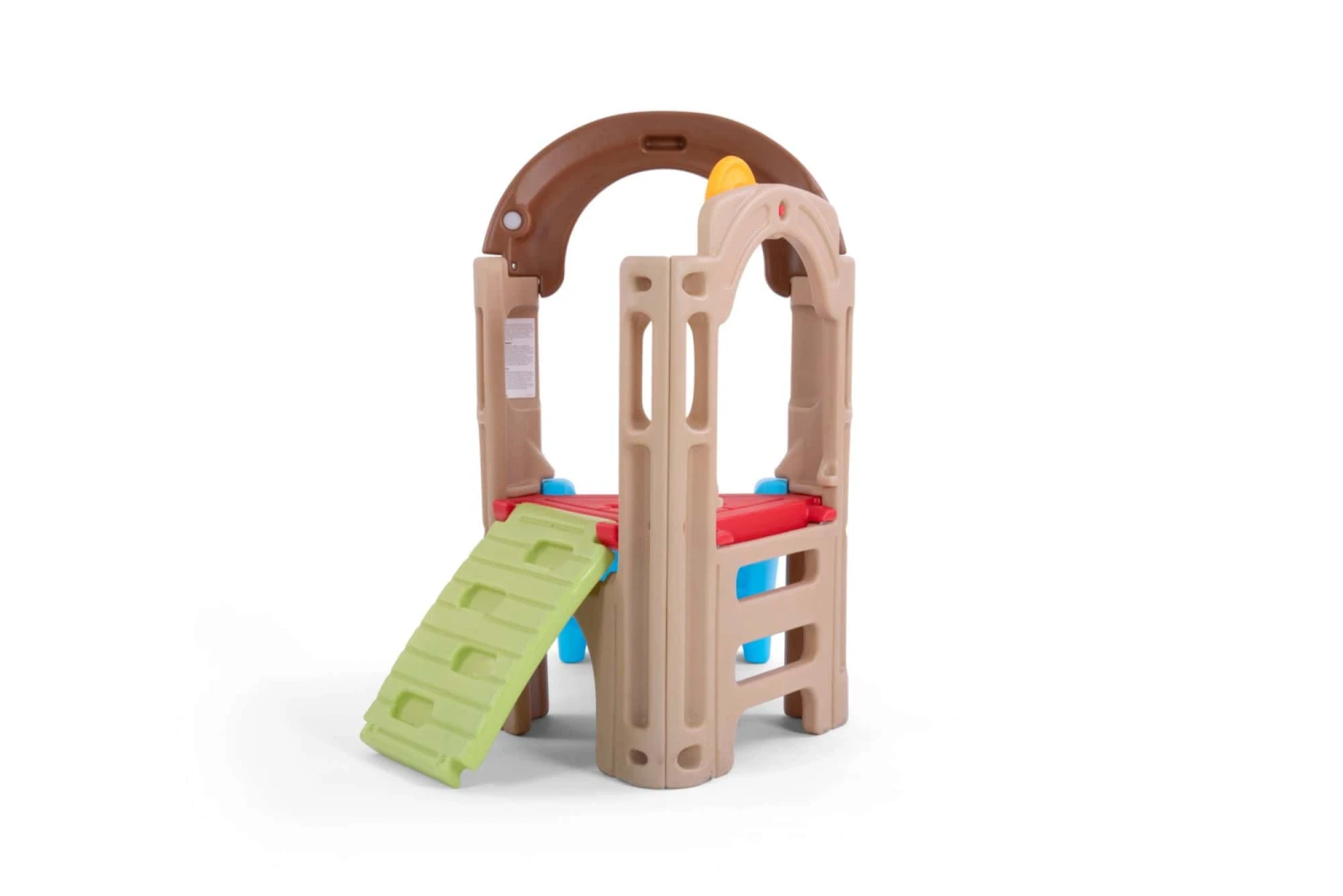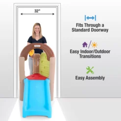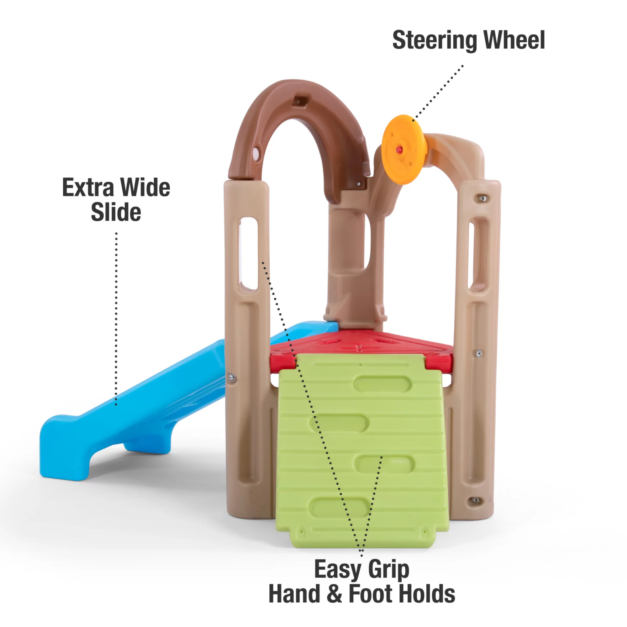 - Two levels of play with crawl-through spaces, climbing wall with easy-grip hand and foot holds, steering wheel and extra wide slide helps kids develop gross motor skills