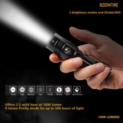 - LONG-LASTING:1000 Lumens max for 131 minutes,Boasts a peak beam intensity of 21,000 CD and a throw distance up to 255 meters,Max Runtime:500 Hours (8 Lumens Firefly Mode).