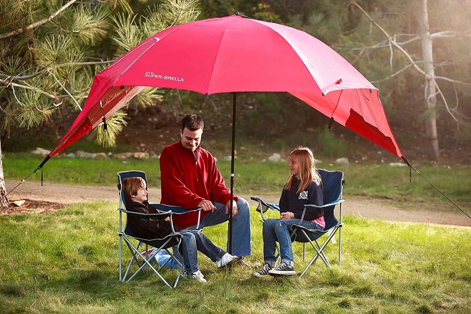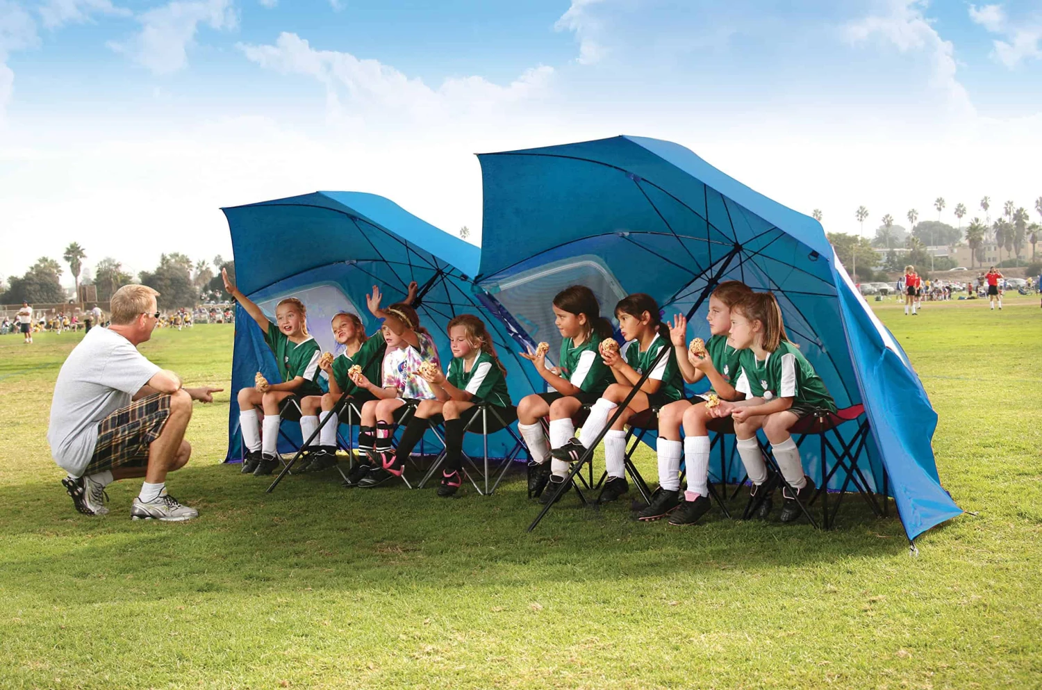 The 8 foot Super Brella provides easy, maximum protection to keep you sheltered from the sun, wind, and rainch It provides side flaps for full shelter protection, zippered windows for extra airflow, and internal pockets to store stakes or other valuables. It is lined with a UPF 50+ undercoating that blocks over 99.5 percent of the harmful UVA and UVB rays. The Super Brella is a simplified version of the Sport Brella and is still great for camping, sporting events, and the beach.