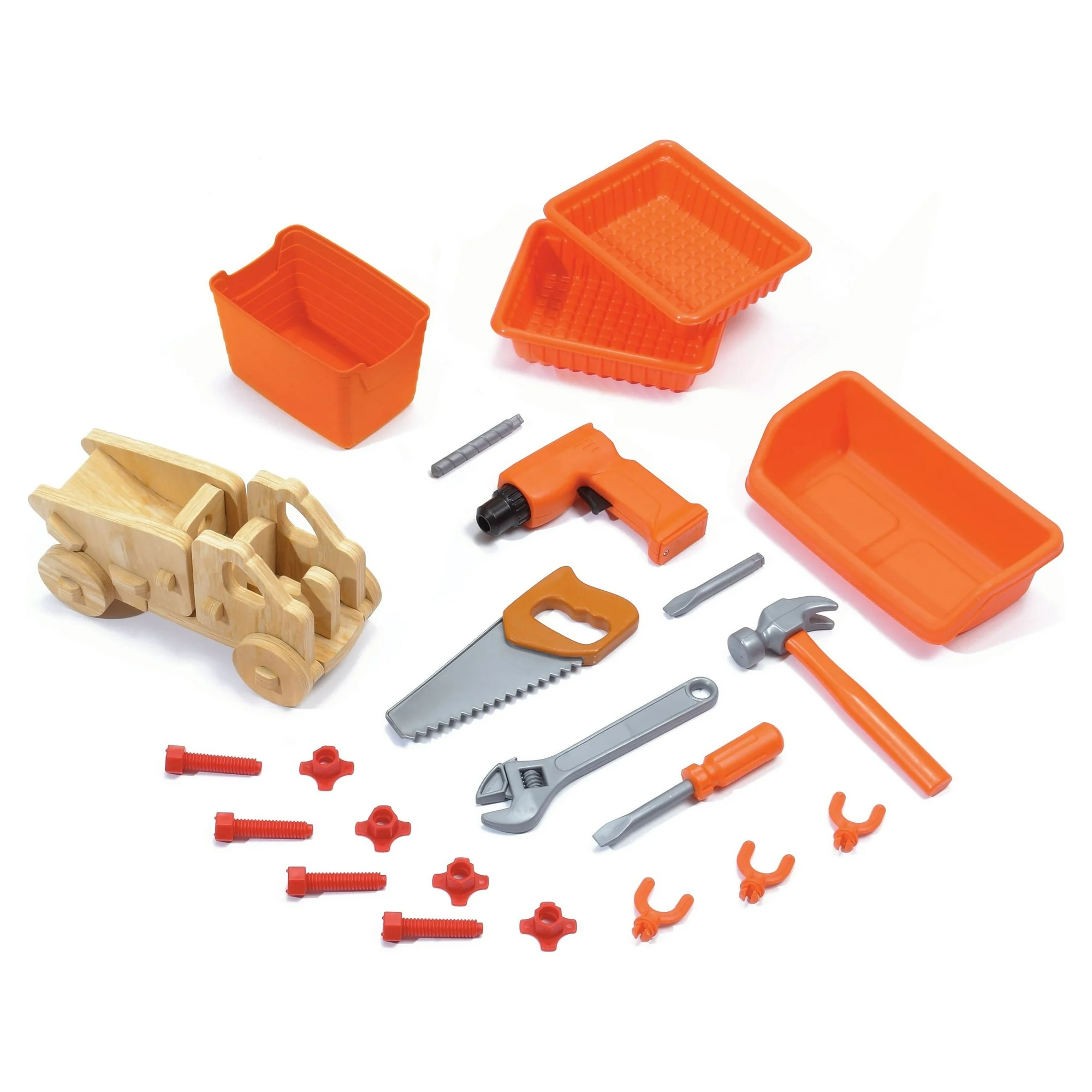 - When playtime is over, hang your tools on the peg board or store them in the storage bins (included)