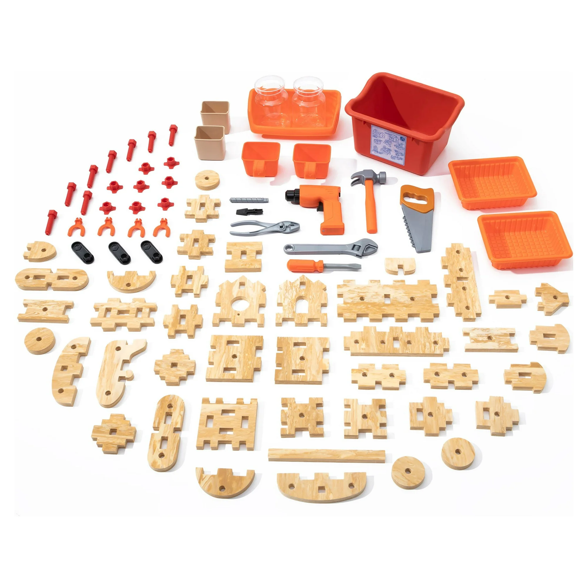 - In the box: Workbench playset with 75-piece accessory set that includes faux wood pieces, storage bins and jars, and pretend toolkit.