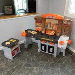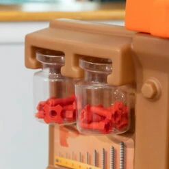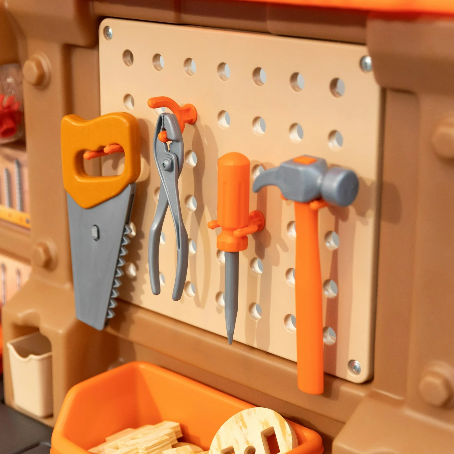 - Clean up after playtime with the molded-in utility sink, and keep the pretend workbench set looking tidy by storing accessories in the storage jars, cabinets and bins, and hanging tools on the pegboard.