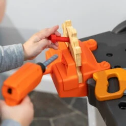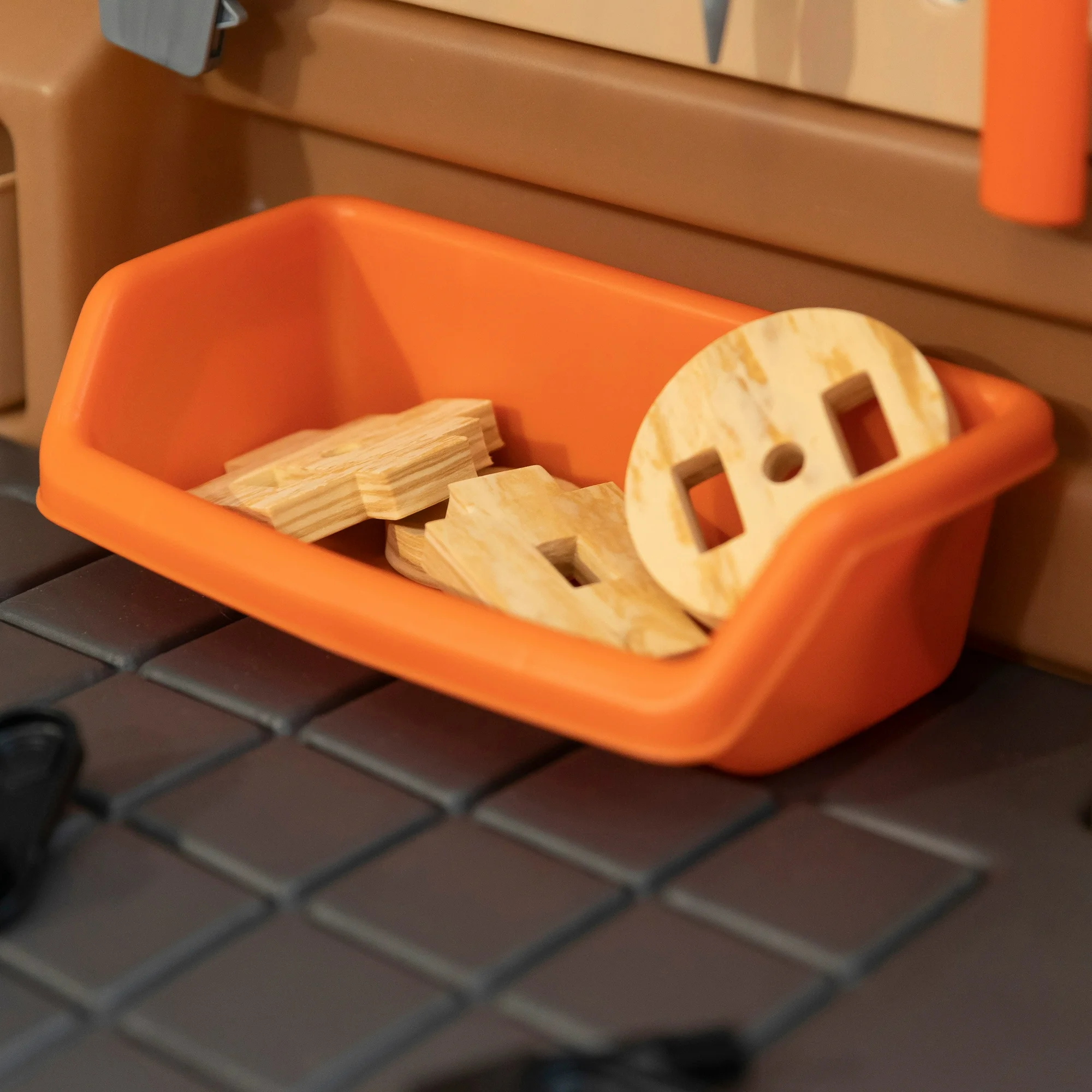 - Molded-in drill and nail holes on the workbench tabletop help kids practice hand-eye coordination as they build.