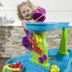 Create a mini water park right in your backyard with the Rain Showers Splash Pond Water Table™ by Step2 the perfect indoor or outdoor toys. The two-tier water table for toddlers designed to be a kids outside toys. creates a showering splash below! Just scoop up water from the pond and pour into the top tray to make it rain. Watch as a rain shower drizzles back into the pond and activates the maze-like spinners, bucket and ramps, a great way to show a cause and effect relationship and promote STEM play while using the Rain Shower water activity table. From the side flipper to the put-and-place maze pieces, kids will have lots of splish-splash fun with the included 13-piece accessory set enhancing their water play experience! This Step2 kid water play table has a molded-in hole in the back of the table that can accommodate and umbrella and a drain plug for easy water removal when playtime has ended. Best of all with the Step2 logo located on the base of this water toy you know this outdoor play table was built to last, made with sturdy plastics and comes with a limited warranty. This outdoor kid toy will keep your toddler splashing for hours!. Adult Assembly Required.