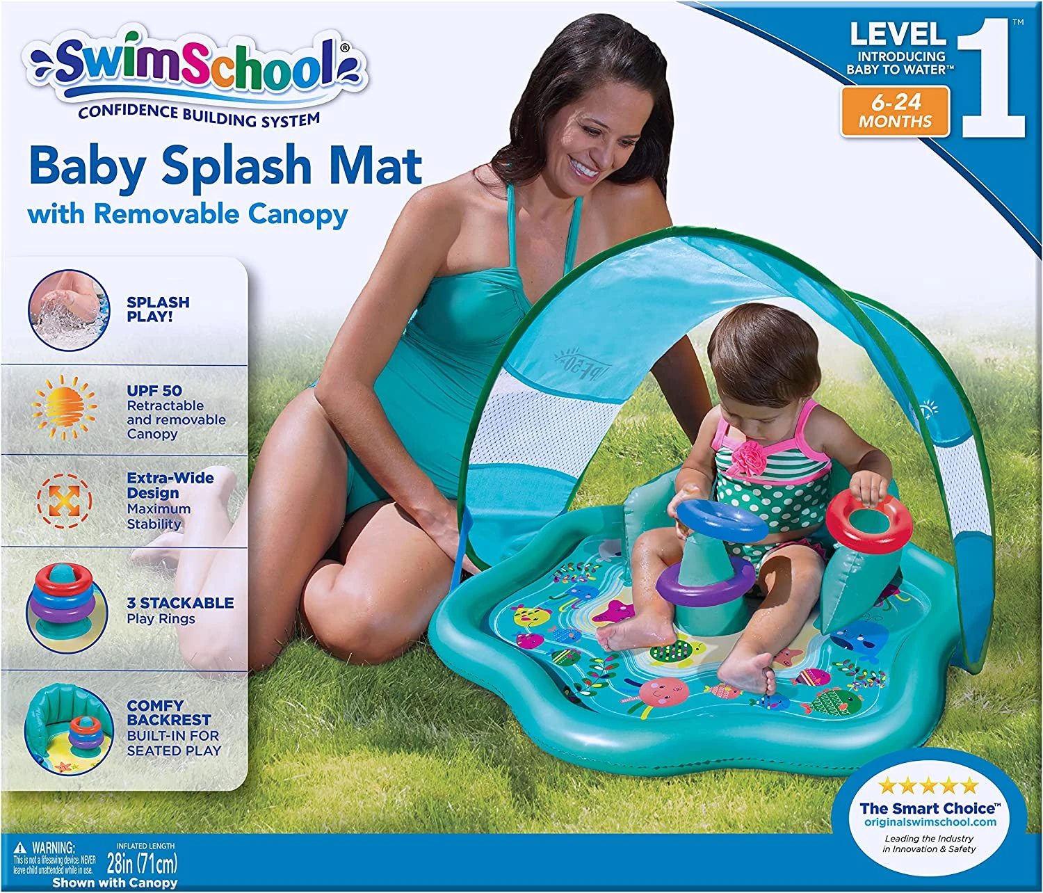SwimSchool Baby Splash Play Mat with Adjustable Canopy โ Includes Baby Water Toy Rings