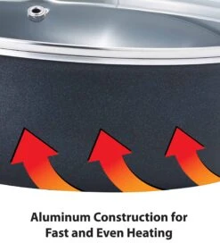 12 quart capacity for cooking family size meals. Superior nonstick interior and exterior make it easy to cook and clean, Healthy cooking results with minimal oils or fat. Glass lid allows you to watch cooking progress, Vented hole lets steam escape to prevent boiling over.
