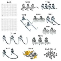 DuraBoard 018-Kit is a complete wall storage system consisting of DuraBoard polypropylene pegboards, an assortment of DuraHook locking pegboard hooks and plastic hanging bin system for small items. Whether storing garden, hand or craft and hobby tools, sports equipment or small items, DuraBoard 018-Kit handles it easily. Everything required to start organizing your items is in one box that takes minutes to mount to any flat wall surface. Included in the system are: (2) 18 in. x 22 in. x 1/8 in. DuraBoard polypropylene pegboard, (4) 1in. Single Rod 30° DuraHook, (2) 2-1/2 in. Single Rod 30° DuraHook, (3) 3/4 in. DuraHook Pliers Holder, (2) 2-3/4 in. Double Rod 80° DuraHook, (3) 1/4-1/2 DuraHook Ext Spring Clip, (2) 1/4-1/2 DuraHook Standard Spring Clip, (2) 1/2-1 DuraHook Standard Spring Clip, (3) 2-1/4 Curved DuraHook, (1) 2 7/8-1 3/4 U-Shape DuraHook, (1) Pegboard Spacer Kit for installation.