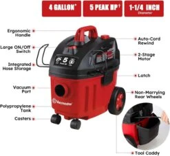 - 4 Gallon Wet/Dry Vacuum: This shop vacuum is equipped with a 5 peak HP motor and 4-gallon polypropylene tank. Offering the perfect size and power for a variety of tasks in the house.