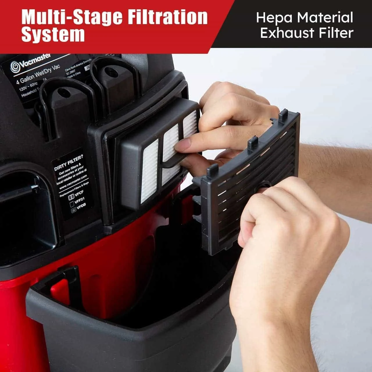 The Vacmaster 4-gallon* 5 Peak HP† wet/dry vacuum is perfect for jobs around the house. With a 2-stage motor this wet/dry vac makes cleanup easy and quiet. The HEPA material exhaust filter ensures that the air filtering back into your home is dust and allergen free. The balanced top handle design, durable casters, and non-marring rear wheels provide stable and safe transportation in and around your home. The on-board hose and accessory storage allows you to keep all of the attachments organized and on-hand, while the automatic cord rewind makes wrapping up the job a breeze. This item ships from our US warehouse. If you have any questions, please contact our support team.