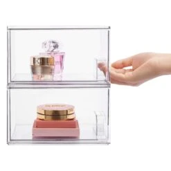 - [Stackable Design] Come with 4 drawer storage organizers, each organizer measures 7.5″D x 6″W x 4.4″H. The storage containers are stackable, vertical storage will save a lot of space. You can also use them side by side. Put your small objects on top of acrylic bins to make your countertop space more tidy.