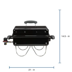 For 2014, this newly redesigned Go-Anywhere gas LP BBQ grill is Compact but has a generous grilling area for tailgating and camping. Plated steel legs pivot to lock the lid in place for carrying. The Go-Anywhere gas grill now has a porcelain-enameled cooking grate for a better cooking experience.