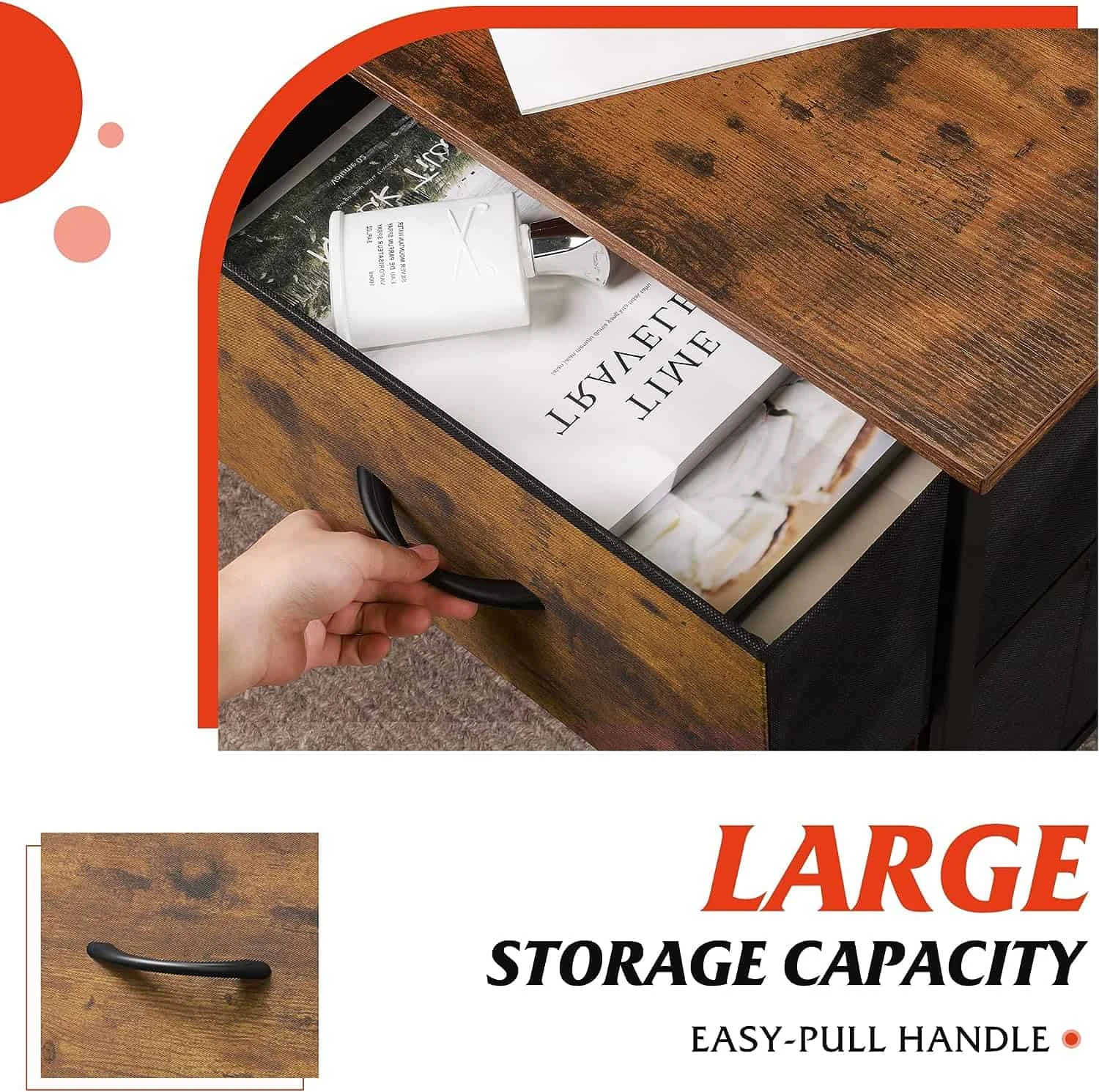 - SPACIOUS STORAGE: The 2 fabric drawers of the small dresser offer large storage space for nighttime necessities. The wood top is ideal to place alarm clock, phone, charger, eyeglasses, keeping them in your reach.