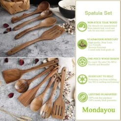 - The wooden cooking utensils set are handmade by natural teak wood without any coating. Wooden spoons and spatulas are a non-toxic and eco-friendly alternative that does not leach toxic chemicals into your food while cooking like other types of utensils do.