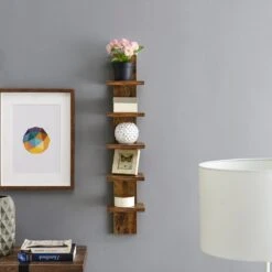 Perfect for putting small potted succulents on display, staging framed family photos, and letting knick-knacks draw the eye, this shelf takes your ensemble upwards. Crafted from manufactured wood, it offers a contemporary appearance with a clean-lined silhouette and a neutral walnut finish. Measuring 30” h x 6” w x 5.5” d, it includes five open shelves. Assembly and installation are required for this product, which you will need a screwdriver for.